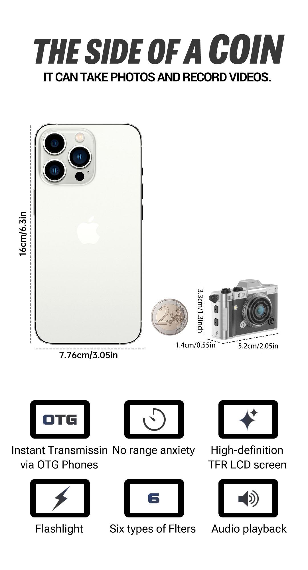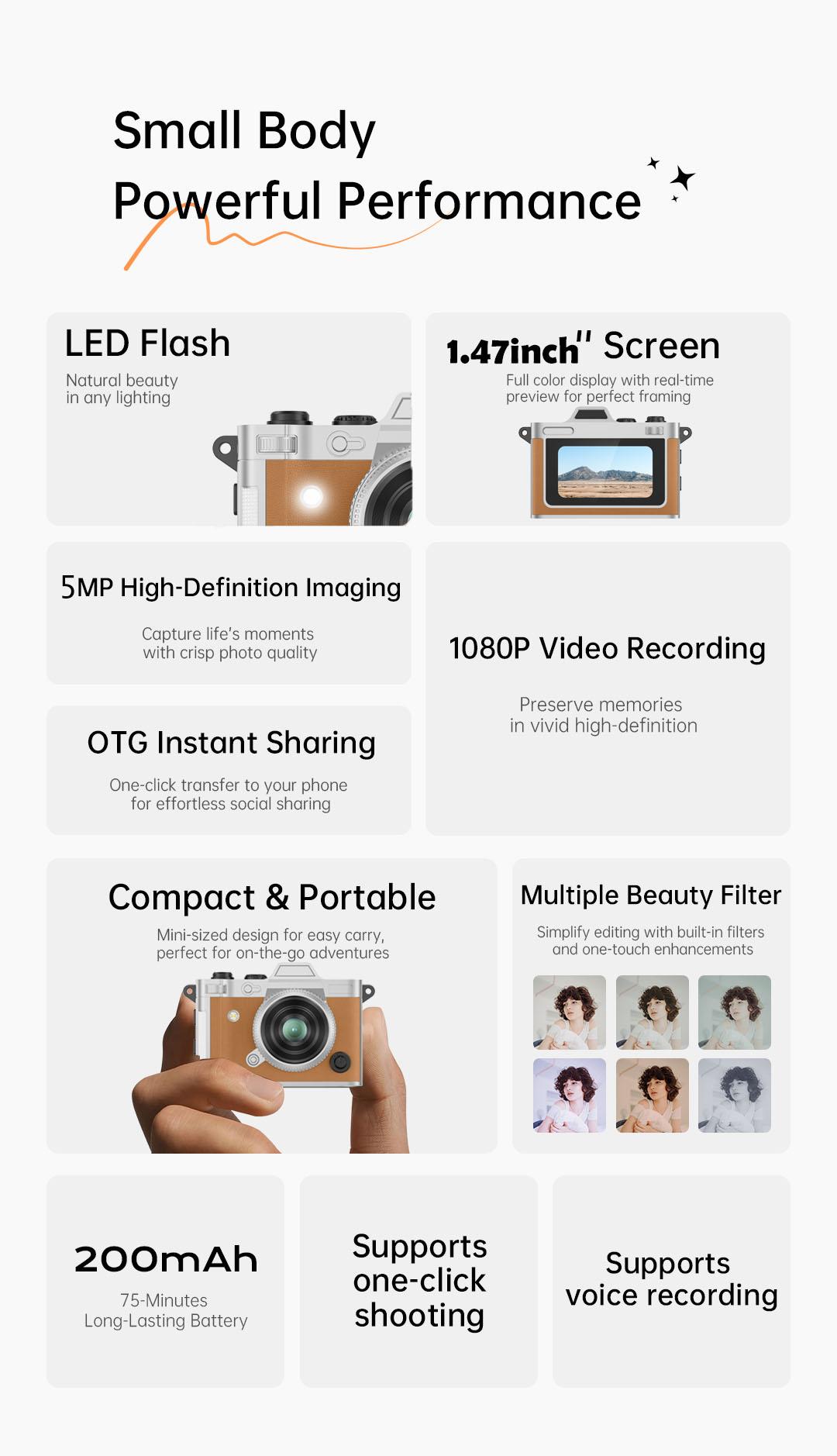 Don’t let its size fool you.Equipped with 5MP resolution, it delivers crisp images and vibrant, true-to-life colors.Capture special moments with ease in both photos and videos, preserving memories with clarity.